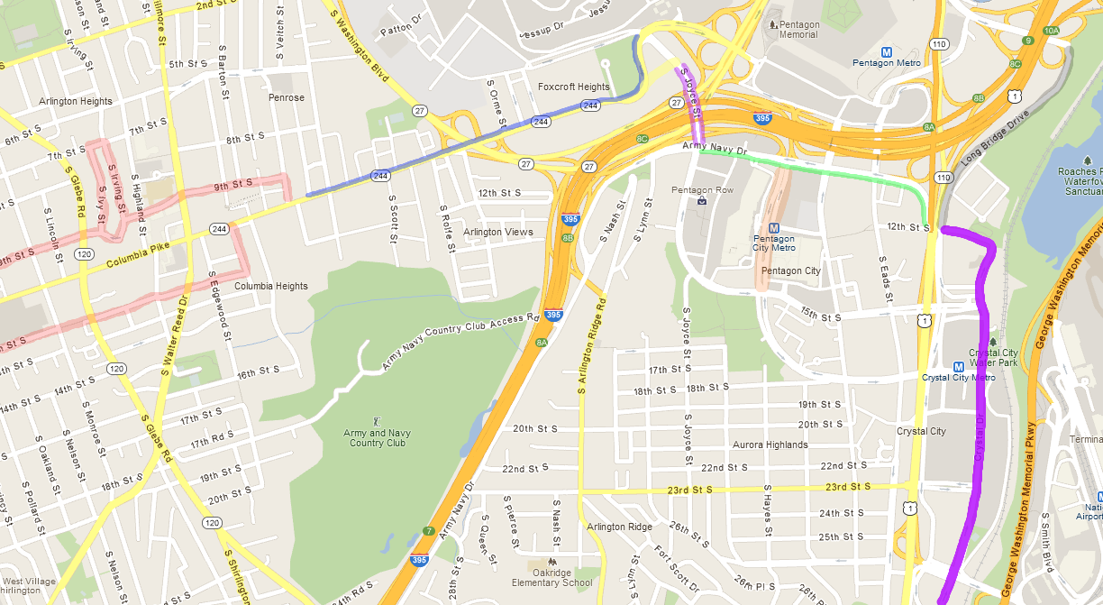 Cycling on-street on Columbia Pike is quite harrowing for any but the most confident cyclists. Traffic volumes are heavy; when not stopped at a light, traffic often moves quickly, especially once you get East of South Courthouse Rd. Cyclists traveling during morning rush have the added joy of needing to ride in the left lane for a while due the the right lane of Columbia Pike becoming a turn lane during morning rush as it approaches the Washington Blvd bridge. Once you're past Washington Blvd traffic volumes thin out a bit, but you're heading uphill to the Navy Annex and what traffic is coming is likely paying little head to the 25 mph speed limit. Once you crest the hill, the downhill toward Joyce makes for a pleasant descent, helping you keep up with oncoming traffic. Joyce Street heading under I-395 is, if anything, worse than most of Columbia Pike - wide lanes and a freeway like appearance cause cars to exceed the already inexplicably high 35 mph speed limit. To make things worse, the sidewalk isn't even a reasonable alternative to any of this. The sidewalks along most of Columbia Pike and along Joyce are narrow, riddled with obstacles, bumpy and frequently chock full of folks waiting for the bus. Riding in the neighborhoods on either side of the Pike so as to avoid biking the Pike is possible but challenging (bring a map!) - street connectivity is spotty and no one road will allow you a signalized crossing of the various North/South arterials.Once you've made it to the East side of 395 those heading for the Metro now have the option of a round-about route with bike facilities (Joyce to Hayes) or contending with a 6 lane arterial (Army Navy Dr). Those heading for Long Bridge Park again have a round-about option (Joyce to Hayes to 12th across the bike/ped path continuing on 12th to Long Bridge Dr) or contending with Army Navy Dr. Were it not for the one-way portion of 12th/Crystal Dr cyclists could avoid Long Bridge Dr altogether and directly access the Long Brideg Dr esplanade from the corner of 12th & Crystal Dr. Those heading to southern Crystal City or Potomac Yard will find themselves stymied by various one-way portions of Crystal Dr and a lack of decent east/west access roads to get to it in the first place - 15th St, 18th St, 23rd St - none of these have bike facilities. If you're just passing through you'll probably want to stick to Eads St though it's bike lanes could use some TLC.